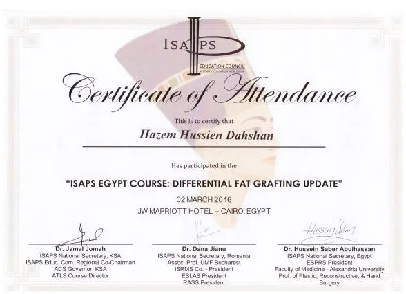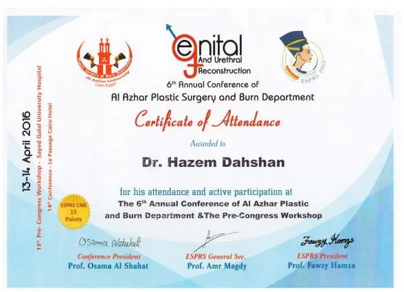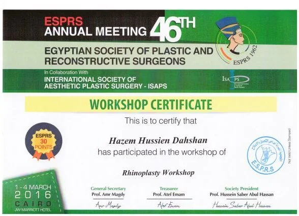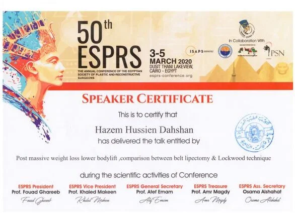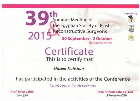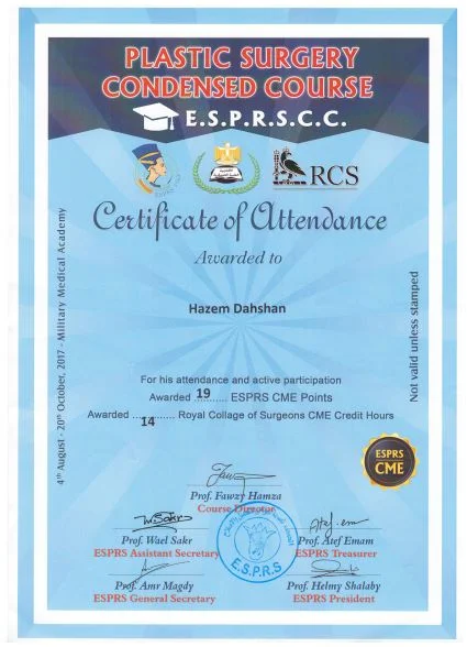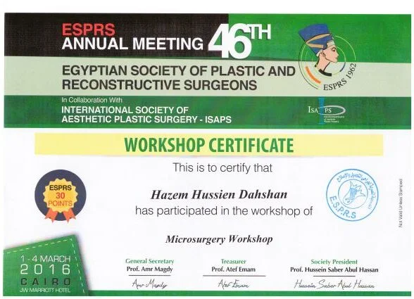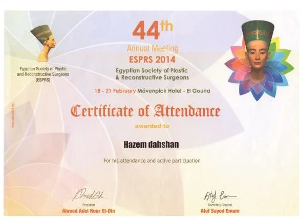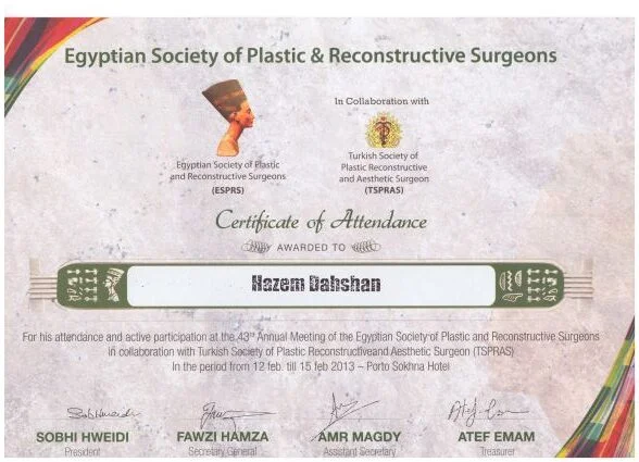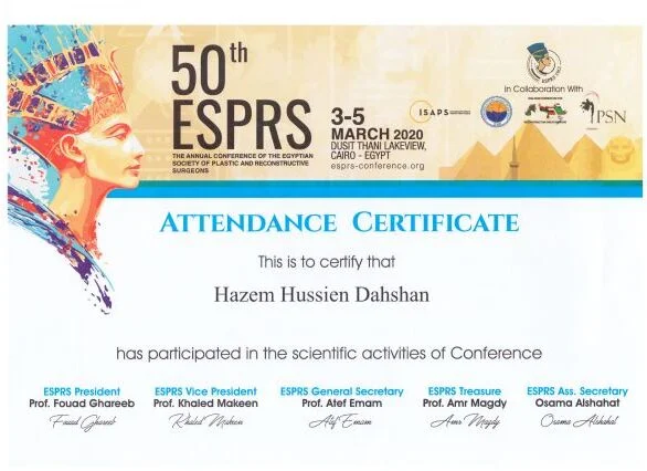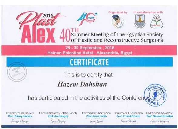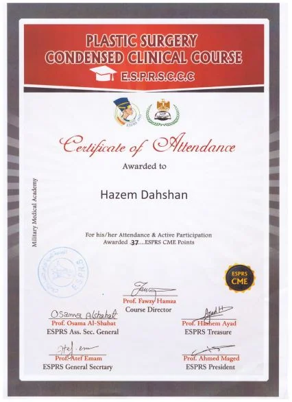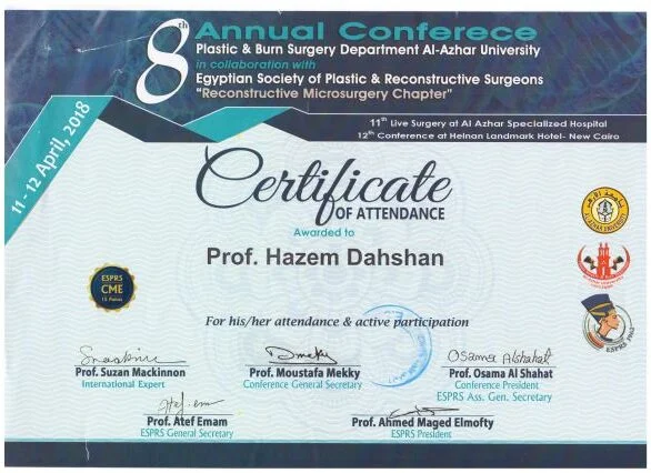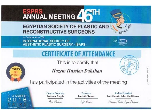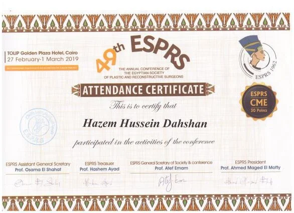 ⦁ 2002–2008 – Bachelor of medicine and surgery MBBch degree. Grade (excellent with honor grade) from Al Azhar university, Faculty of medicine , Egypt ⦁ 2010-2014 – Residency in Plastic and Reconstructive Surgery – Al Alzhar University. ⦁ 2013 – Master Degree in General and Plastic Surgery , Grade (very good with honor grade)- Al Azhar Unversity. ⦁ 2018 – Doctor degree in plastic, Recnstructive Surgery and burn (MD) – Al azhar Unversity. ⦁ Active Member of the Egyption society of plastic & reconstructive surgeons (ESPRS) ⦁ Member of AOCMF (craniomaxillofacialorganization) ⦁ Member of the Egyption society of Hand and microsurgery ⦁ Member of International Society of Aesthetic Plastic Surgery (ISAPS) ⦁ Member of American Society of Plastic Surgeons (ASPS)Lecturer of plastic ,reconstructive surgery and burn department, Al-Azhar University hospitals- Faculty of medicine- cairo Consultant of plastic and reconstructive surgery ; Suadi German hospital- cairo Consultant of plastic and reconstructive surgery ; Alharm hospital –